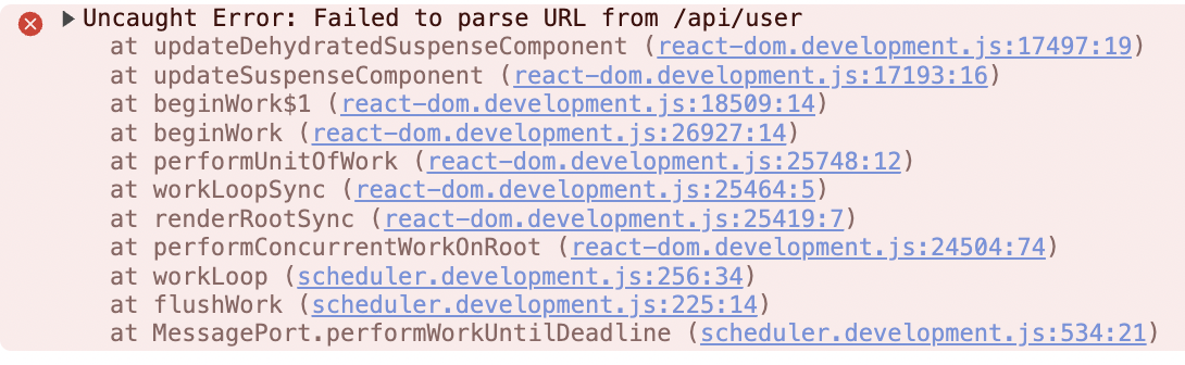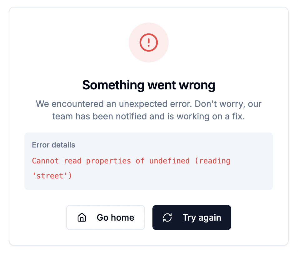 Start the project with npm run dev and navigate to the User Profile page via the dropdown or directly via the/users/1 route. You'll see the "Something went wrong" page with handy errors right there: