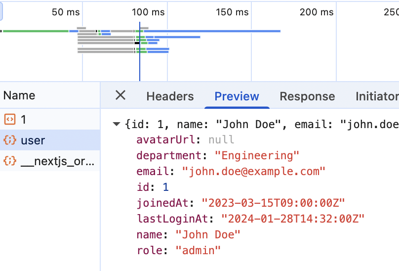 Hovering over those bars will give you the information on what's what. The blue bar shows the browser downloading the RSC payload for the User page, and the gray bar shows the request to the /api/user API endpoint. The one that returns the user data.