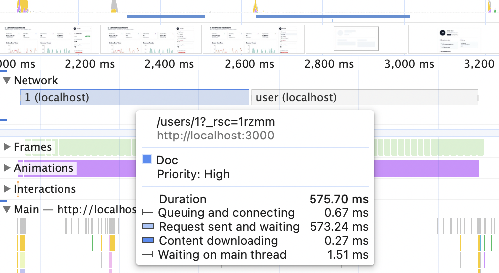 Then, in Chrome DevTools, open the Performance tab, click the top left "Record" button, and navigate to the User page by clicking the link in the Profile dropdown. The recording should be something like this: