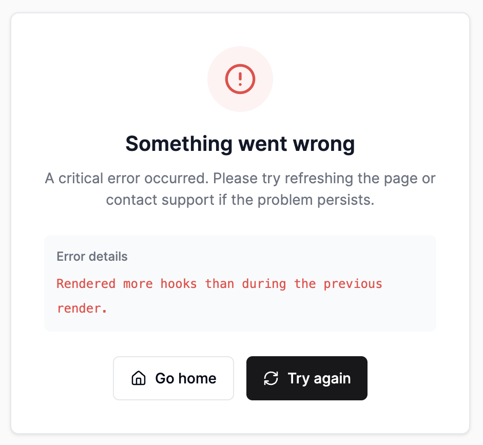 The error, however, is not expected and needs to go away. In the browser's console, I see the same error: Rendered more hooks than during the previous render.
