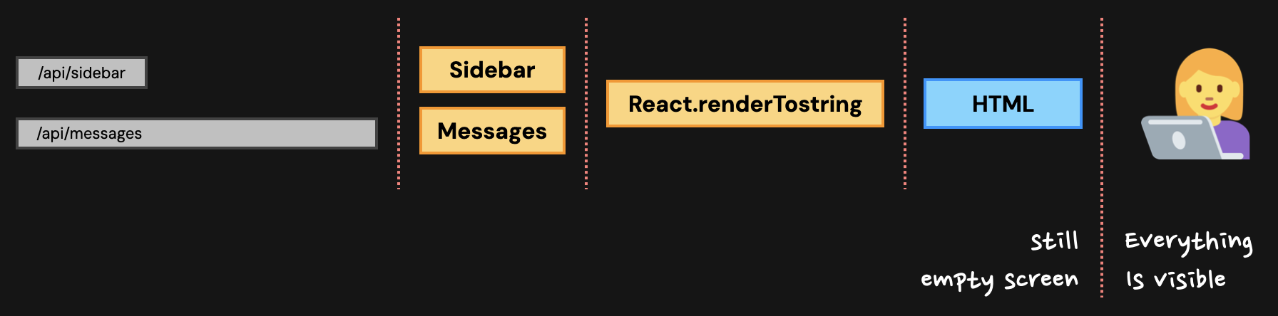 Now it will behave as advertised. React will render everything on the "critical path" first, without waiting for the async components inside Suspense to be done with data fetching. This will be the first chunk. The server then will send this chunk to the client and keep the connection open while waiting for the suspended components. I.e., chilling and waiting for promises to resolve. After the Sidebar data finishes, its Suspense boundary is resolved, another chunk is ready and fed to the client. Same with Messages.