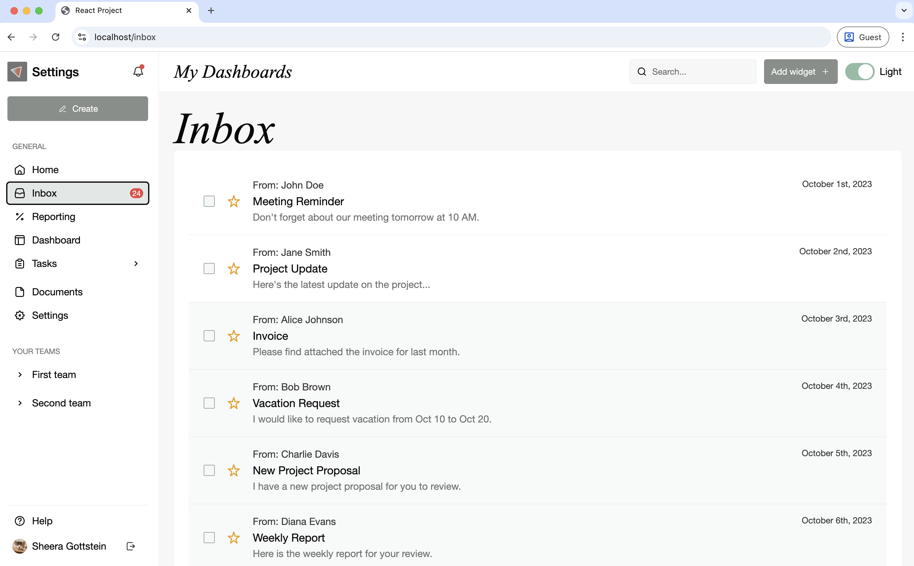 Some data on that page is dynamic and is fetched via REST endpoints. Namely, items in the Sidebar on the left are fetched via the /api/sidebar endpoint, and the list of messages on the right is fetched via the /api/messages endpoint.