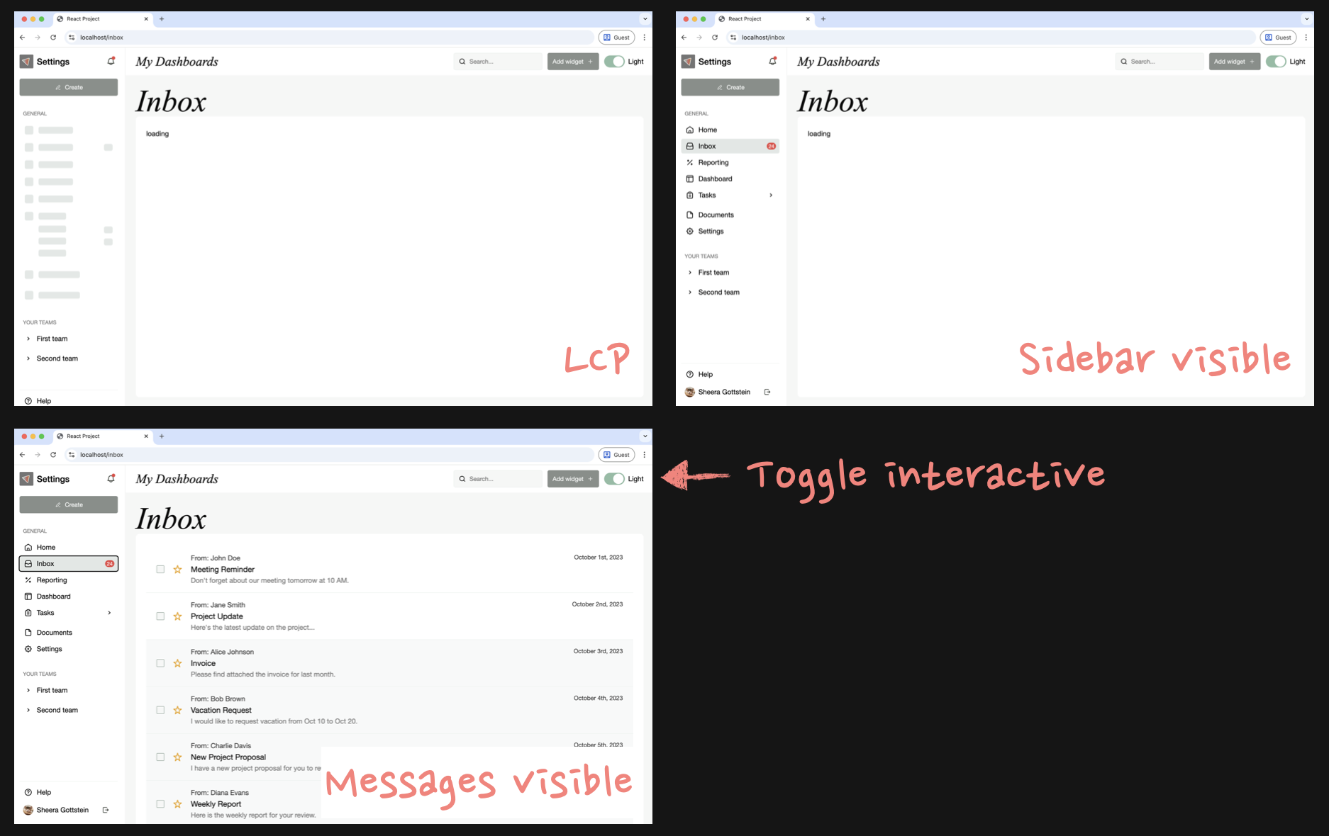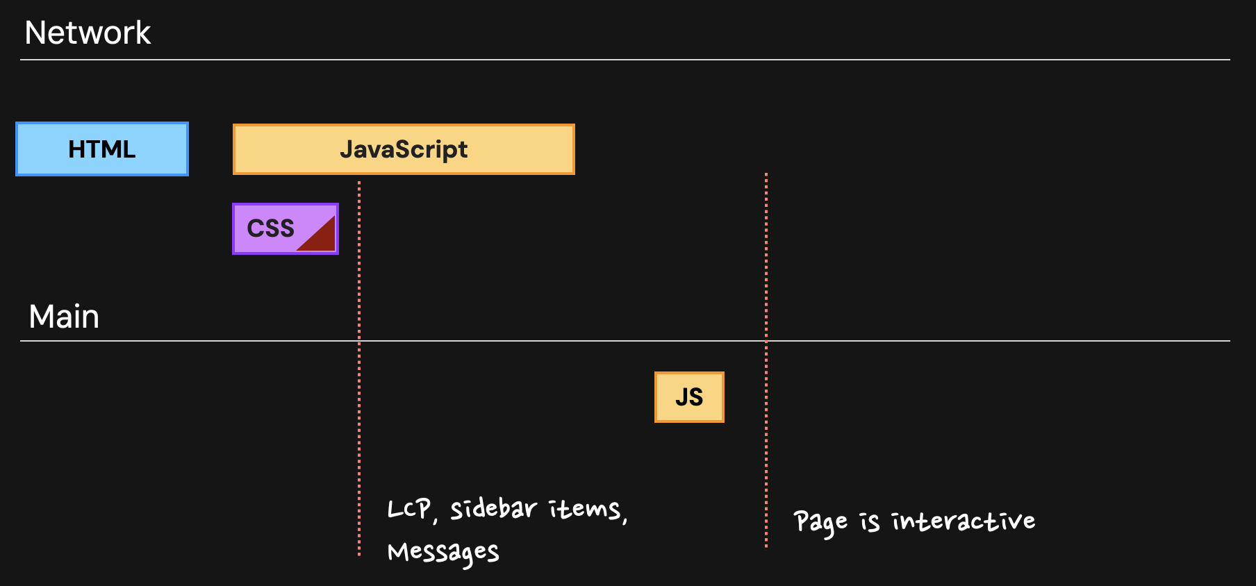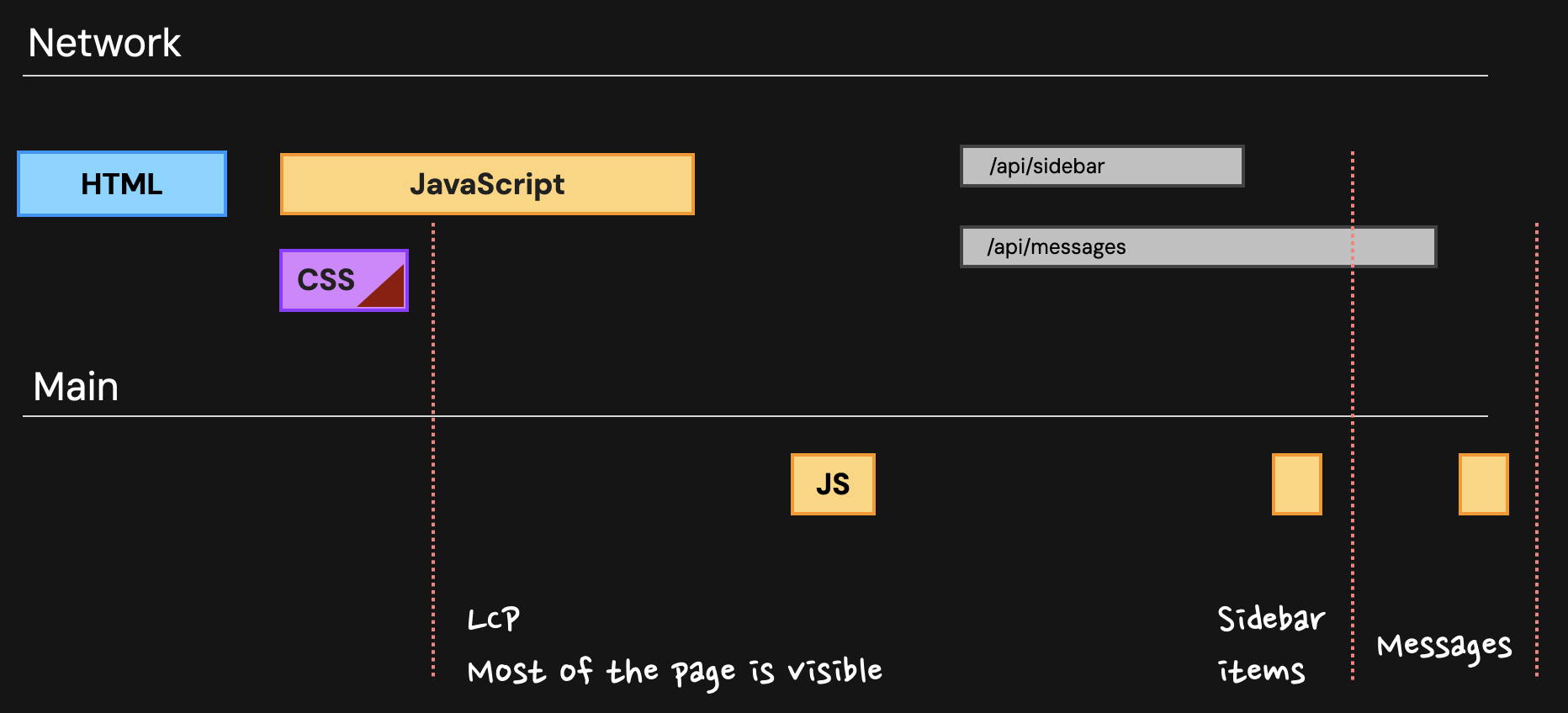 Also, only the LCP mark has moved in that picture. The "Sidebar items" and "Messages" are in exactly the same places, structurally speaking. This is because we haven't changed the code a bit and are still fetching that data on the client! Somewhere deep in the React code, we still have something like this: