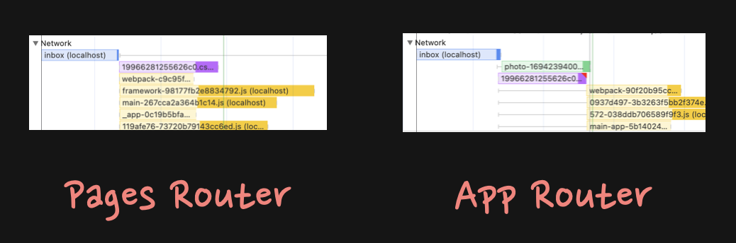 First, Next.js App Router seems to delay all JavaScript until after the CSS is loaded. The Pages version didn't do that and was loading CSS and JavaScript in parallel. As a result, JavaScript loading "stole" a bit of bandwidth, and CSS was loading slower in Pages, thus delaying the LCP value. This accounts for the 500ms gained for the LCP. And in ~700ms loss in everything else. You can find it in the Network section.