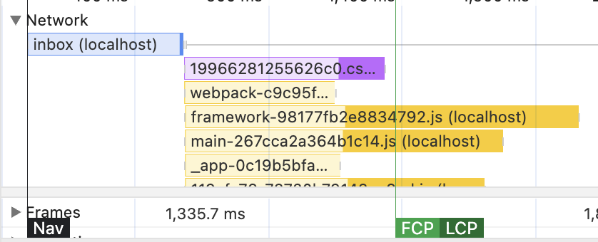 And lastly, I'm going to hit the HTTP/1 limits on concurrent connections pretty soon. All the local Node-based servers are HTTP/1 by default, including Next.js. In Chrome, this limit is just 6! In the HTTP/1 world, if I try to download more than six resources (i.e., JavaScript files in my case) from the same domain at the same time, they will "queue" according to the limit.