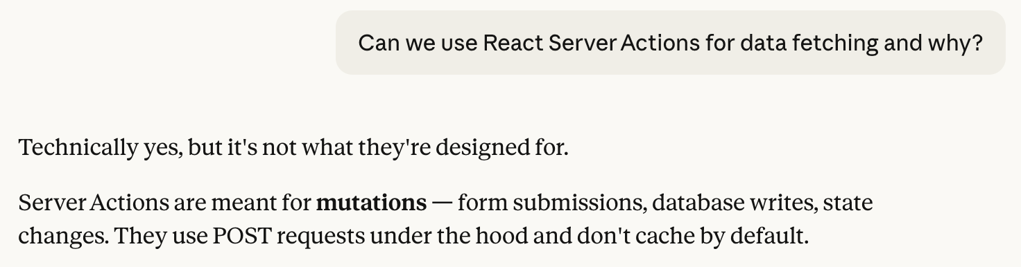 Okay, so what are the arguments against Actions for data fetching? The most common one is "they are not designed for it". If I ask my good friend Claude this question, this is the very first response, which kinda proves that it is indeed the most common one.