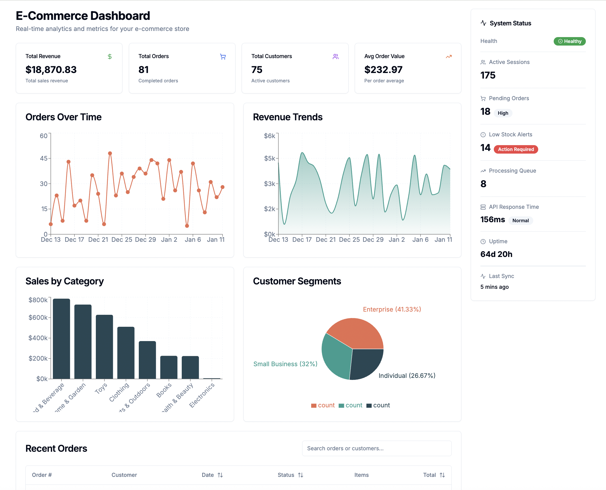 <><DashboardHeader /><MetricsCards /><DashboardGrid><OrdersLineChart /><RevenueAreaChart /><SalesByProductBarChart /><CustomerDistributionPie /><OrdersTable /><ProductsTable /></DashboardGrid></div>{/* Right Sidebar */}<div className="flex-shrink-0"><StatusSidebar /></div>