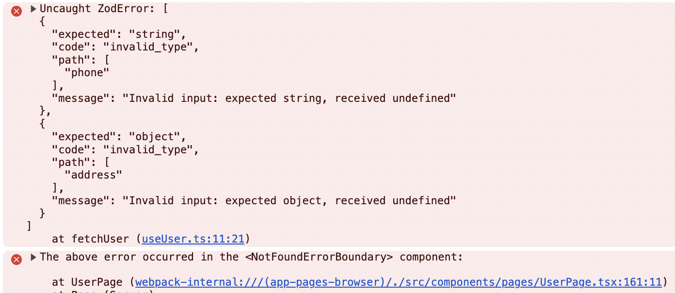 Uncaught ZodError: [ { "expected": "number", ...at fetchUser (useUser.ts:11:21)at UserPage (webpack-internal:///(app-pages-browser)/./src/components/pages/UserPage.tsx:161:11)