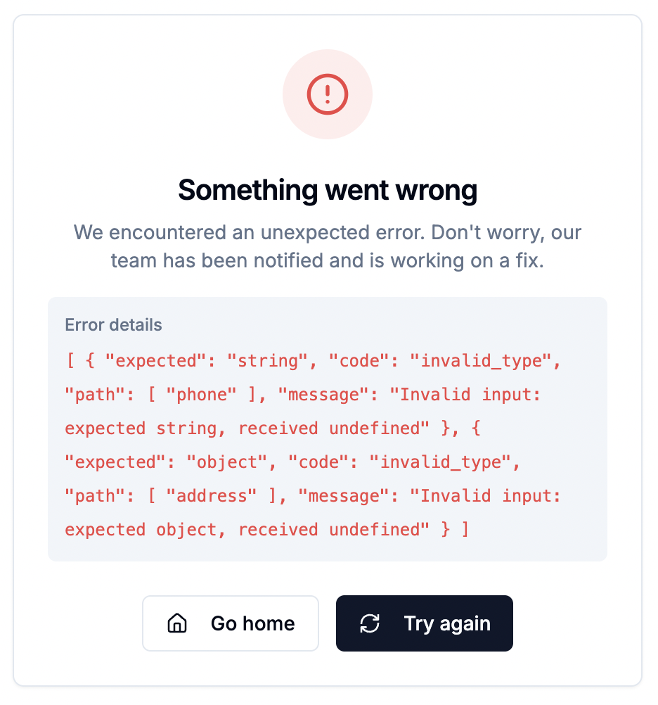 [!NOTE] LLM investigation The issue was that the getUser service was returning a user object missing the phone and address fields required by UserSchema in src/lib/schemas.ts:238-255. When Zod validated the API response on the client side, it threw an error because these required fields were undefined.