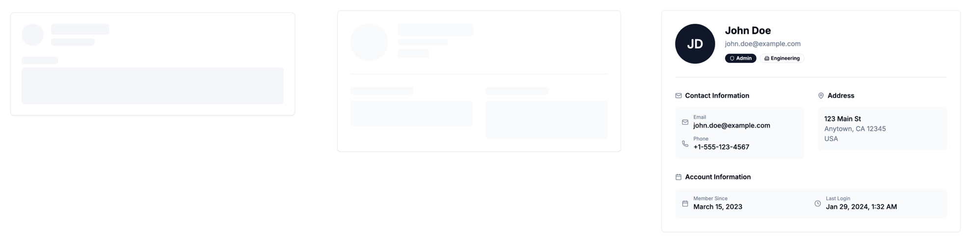 We could also refactor the User page to only hide the dynamic data under the skeletons. So instead of loading skeletons that cover the entire page, we'll show some text almost immediately, after the "green" skeleton, giving the user the impression that the page is progressively loading.