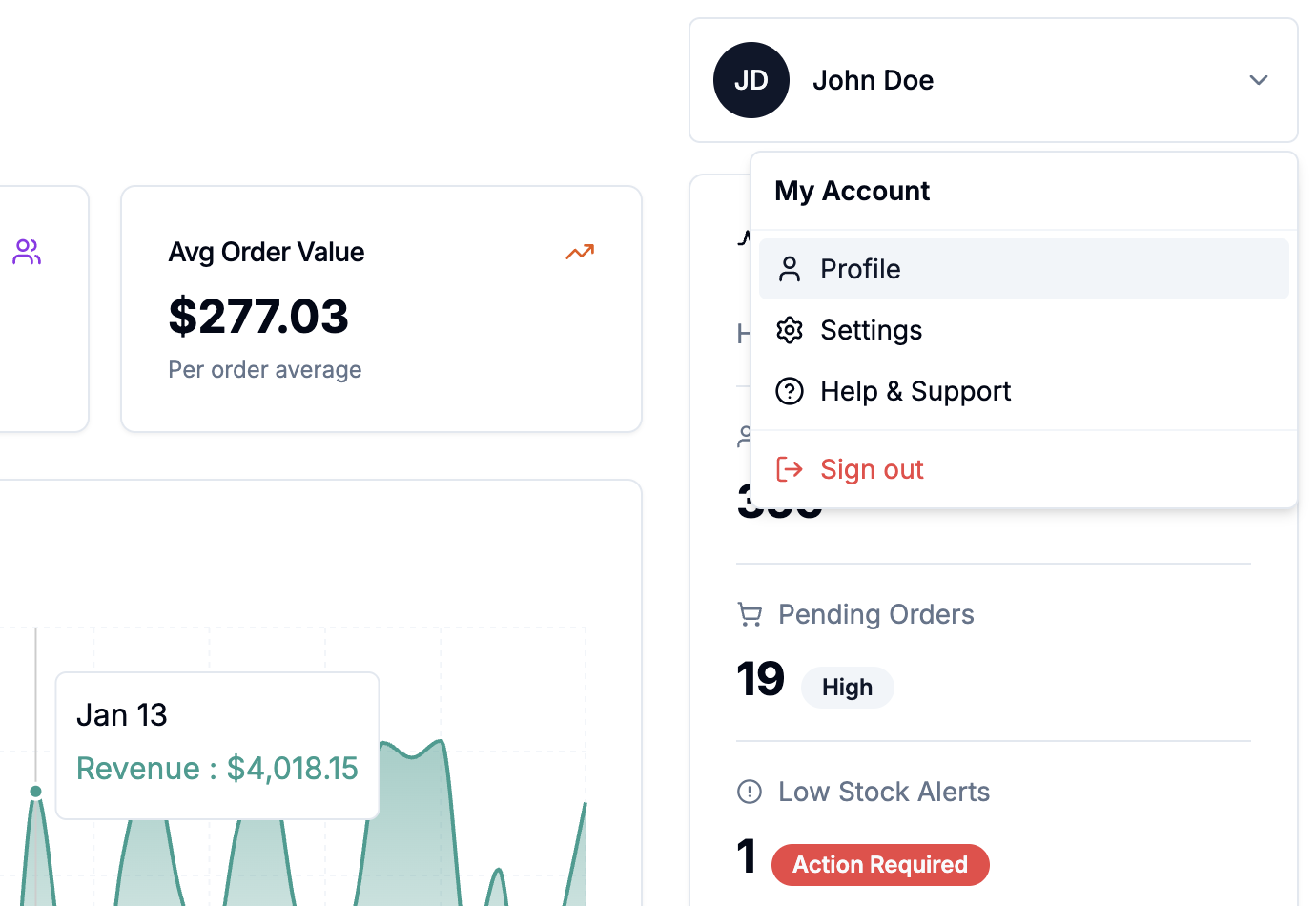 When you open it, you'll see a beautiful dashboard page. Click an Order ID to see more detailed Order information. Click a Product ID to see more info on a Product. Clicking the user's name in the top-right corner opens a dropdown with a few more links. Clicking "User Profile" leads to a page with all the information about the user.