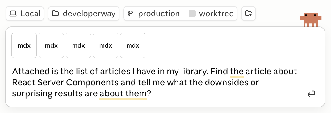 In the previous article, in the first experiment, I sent the AI five of my performance-related articles as a text message (literally injected files' content into the message itself) and asked questions about React Server Components. This cost me around 46k tokens, since all five articles were injected into the Context.