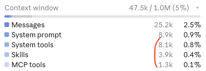 I hope a red warning light in your brain started blinking just about now, while you're remembering how many of those you installed recently. Because yes, all of them will end up in Context. All of them will be sent back and forth with every message, slowly eating away tokens and potentially confusing the AI. Not to mention all the system tools and prompts Claude has just to keep itself sane.