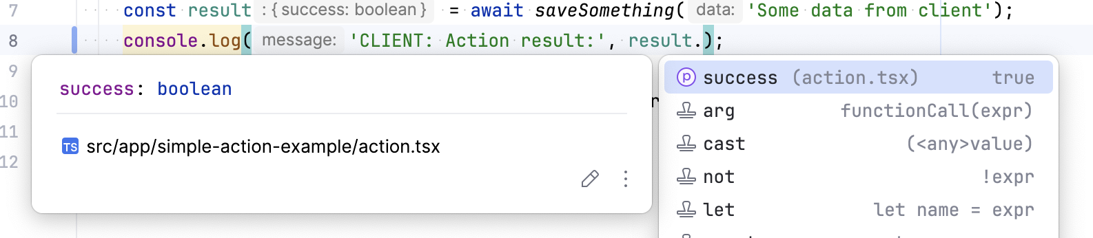 // I can just console.log "result.success" as if it's a normal importconst onClick = async () => {const result = await saveSomething('Some data from client');// completely type safeconsole.log('CLIENT: Action result:', result.success);};